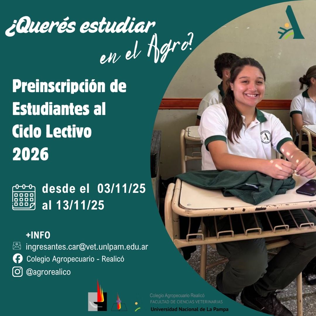 El enlace para la Preinscripción es el siguiente: https://forms.gle/9RaU5QBCXaFzSYt9A, que lo encontrarás en el perfil de Instagram, y en www.vet.unlpam.edu.ar la solapa de “Colegio Preuniversitario Agropecuario”.