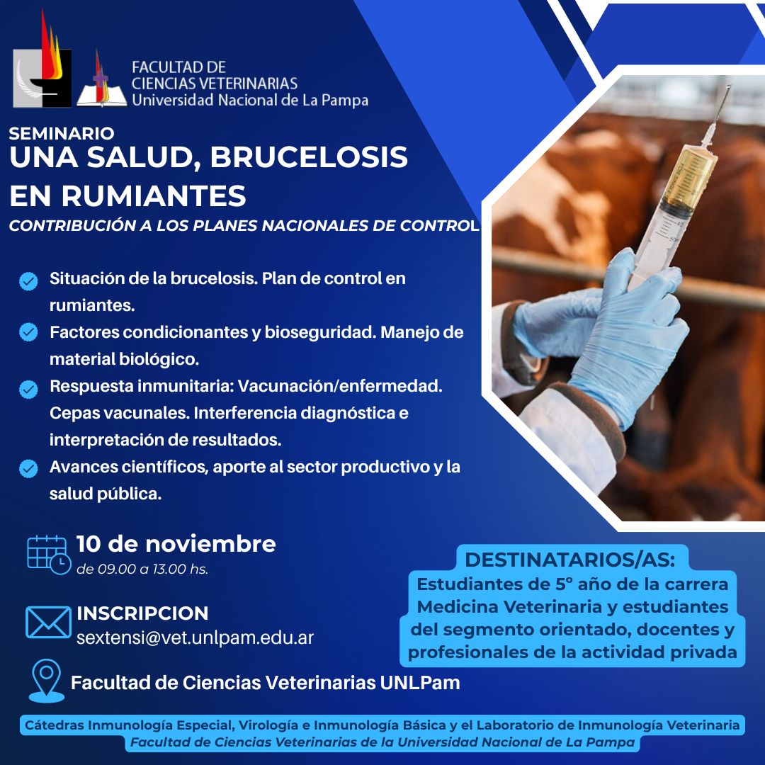 FUNDAMENTACIÓN: La formación de grado y posgrado requiere la continua capacitación y actualización de investigadores y asistentes a la investigación para generar una producción científica de calidad y permanente, y de los/as docentes, estudiantes y extensionistas para implementar los resultados en el terreno profesional y productivo. En pos de garantizar una formación integral y actualizada en concordancia con los constantes avances de las Ciencias biológicas y biotecnológicas, docentes de la cátedra de Inmunología Especial e Inmunología Básica de la FCV-UNLPam, colaboradores de ésta y del Laboratorio LIVe, proponen un seminario de capacitación y actualización presencial de temas involucrados en el proyecto de investigación aplicada, diagramado sobre la problemática productiva y epizootiológica en rumiantes; y en base a reiteradas consultas de profesionales externos respecto al tema propuesto. Para ello, la propuesta se desarrollará como un seminario enfocado en la problemática real de la zona endémica de Argentina, información epidemiológica, antecedentes de intervención por parte de organismos oficiales, diversas metodologías de laboratorio, bibliografía actualizada, trabajos científicos actuales, su contribución y relevancia en el manejo de la Brucelosis en rumiantes a nivel productivo y de Una Salud.