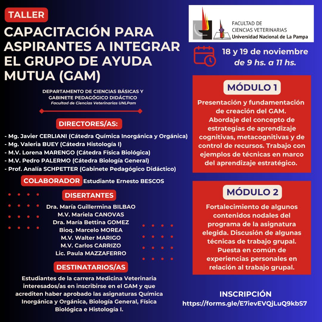 Este taller se propone promover un ámbito pedagógico para el desarrollo de capacidades, actitudes y destrezas didáctico-curriculares de los/as estudiantes avanzados/as de la carrera de Medicina Veterinaria que quieran formar parte del Grupo de Ayuda Mutua de las cátedras Química Inorgánica y Orgánica, Física Biológica, Biología General e Histología I de la de la carrera Medicina Veterinaria de la Facultad de Ciencias Veterinarias de la Universidad Nacional de La Pampa.