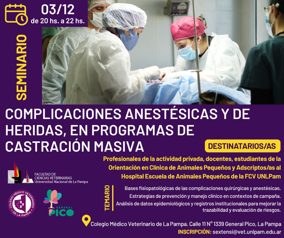 - 21:00 - 22:00 hs: “Complicaciones anestésicas en contexto de campaña de castración”. Esp. María Carolina MIGUEL. Facultad de Ciencias Veterinarias, Universidad Nacional de La Pampa.