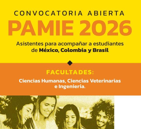 La Secretaría de Consejo Superior y Relaciones Institucionales, a través del Dpto. de Cooperación Internacional, abre una nueva Convocatoria del Programa de Asistentes de Movilidad Internacional de Estudiantes (PAMIE) para el primer cuatrimestre del 2026, período en que se recibirá una estudiante proveniente de Colombia quien cursará asignaturas de sexto año de la Carrera Medicina Veterinaria. La convocatoria permanecerá abierta hasta el 6 de marzo a las 10:00hs.