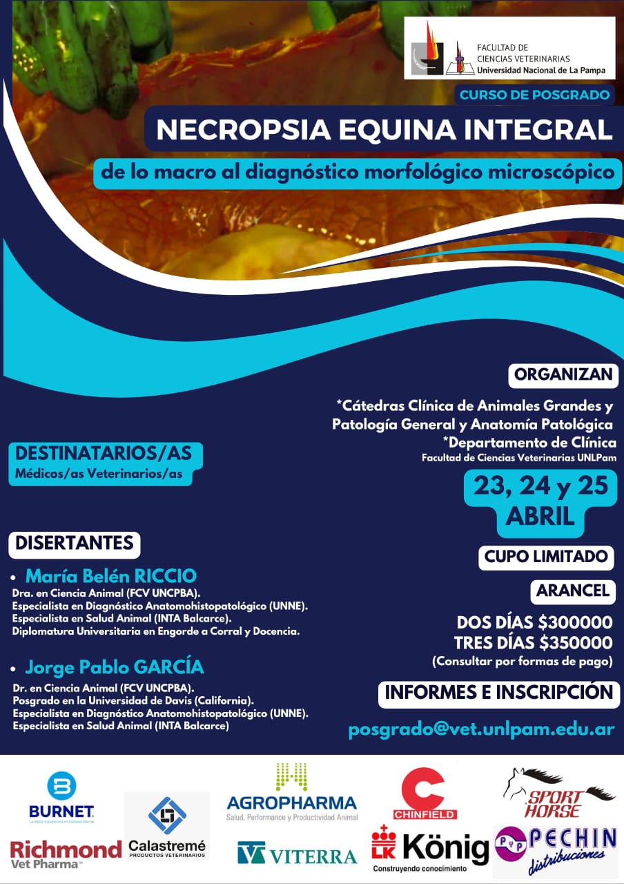 15:20 a 17:30 hs: Patología macroscópica más comunes del equino (digestivo 2) y presentación de casos del Servicio de Diagnóstico de la FCV de Tandil.