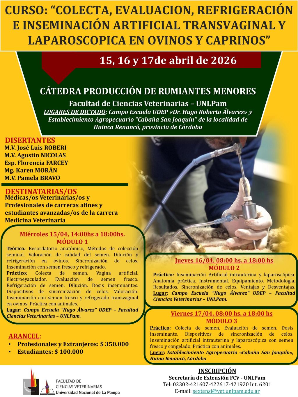 OBJETIVO: desarrollar y optimizar las competencias de un grupo reducido de participantes, brindándoles metodologías comprobadas y experiencias prácticas que les permitan mejorar su desempeño en colección, evaluación, refrigerado e inseminación artificial transvaginal y laparoscópica en ovinos y caprinos.